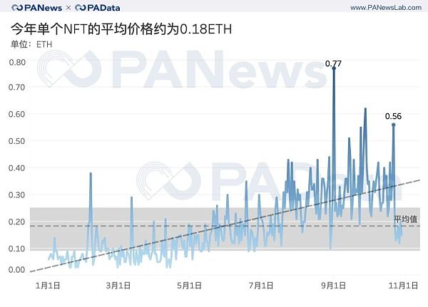 從今年NFT的平均交易價格來看,折算后單個NFT的幣本位均價大約為0.18 ETH,其中最高單日均價達到了0.77 ETH,而且從趨勢來看,今年NFT的交易均價呈現比較明顯的上升趨勢,但是近期均價已回落至全年平均水平附近。