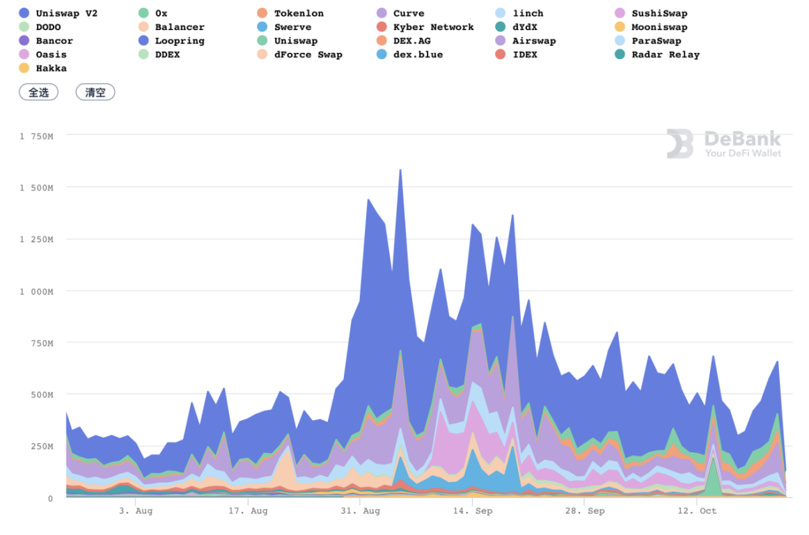 相反的是,將DeFi推向高潮的DEX的交易量卻大幅回落。截至10月22日,Uniswap V2、Curve、0x等DEX的總交易量約為6.55億美元,較9月5日15.81億美元的日交易量下降了58.58%,降幅顯著。