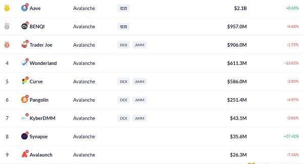 Avalanche鏈上DeFi鎖定資產前十排名及鎖倉量,數據來源:Debank