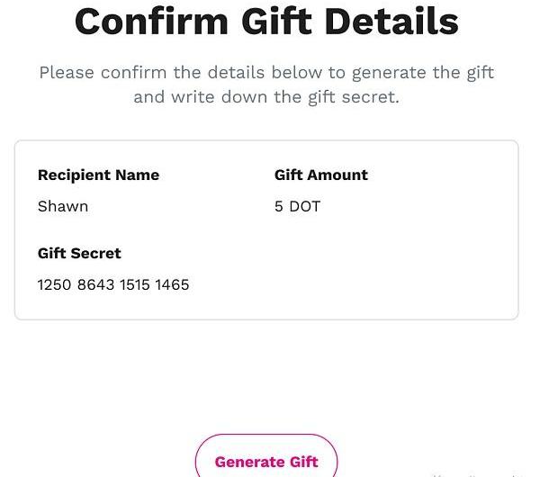 Polkadot禮物可以生成一個獨特的“禮物秘密”,這是一個16位數字,可作為收件人領取禮物的憑證。