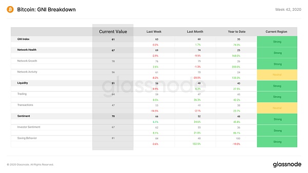 第42周,比特幣鏈上基本面略有下降。GNI回落至61點,相較上周下降2個點。這種下降是由流動性和網絡健康指數的下降引發的,但是情緒指數仍然強勁。