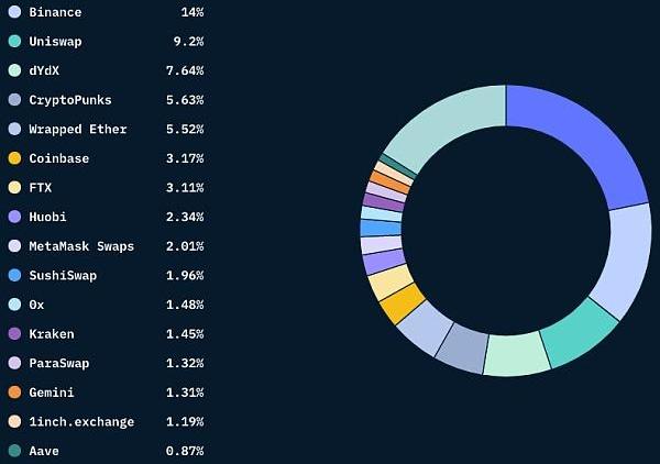 幾乎22%的ETH資金流返回到OpenSea,大概是為了購買更多的NFT。幣安在CEX存款方面位居榜首,占據了流向實體的以太坊流量的13.75%。Uniswap以9%的比例緊隨其后。大約6%也用于與CryptoPunk相關的活動,可能作為購買的資金。