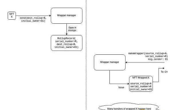 NFT將首先在一個Rollup中注冊。通過創建一個封裝NFT,NFT可以在其他Rollup之間跳轉。