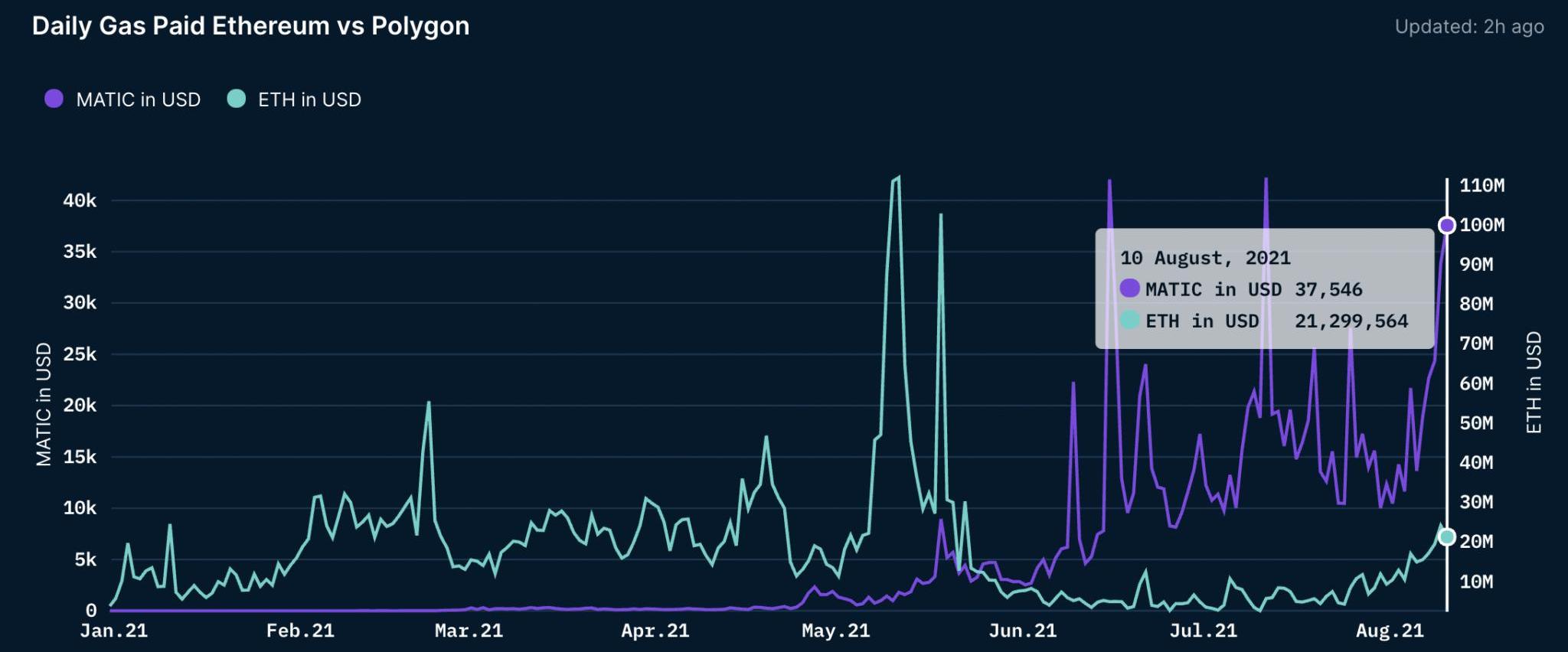 盡管交易量超出近4倍,但Polygon的gas費用總量仍比以太坊的gas費用便宜,略低于4萬美元,而以太坊每日的費用為2100萬美元。