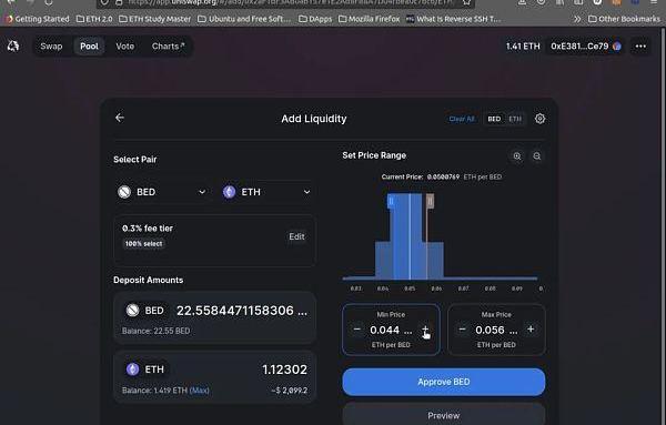 2.輸入你想要提供的BED/WETH數量,并確定你認為最佳的流動性范圍。如果你不太確定什么價格范圍是合適的,建議閱讀一下OverAnalyzer的這篇文章?。