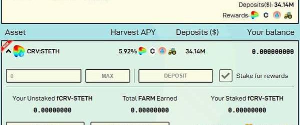 收益聚合平臺HarvestFinance為stETH創建了流動池,用戶可以存入fCRV-STETH賺取聚合收益,當前的APY在5.92%,流動性在34.14M美元左右。