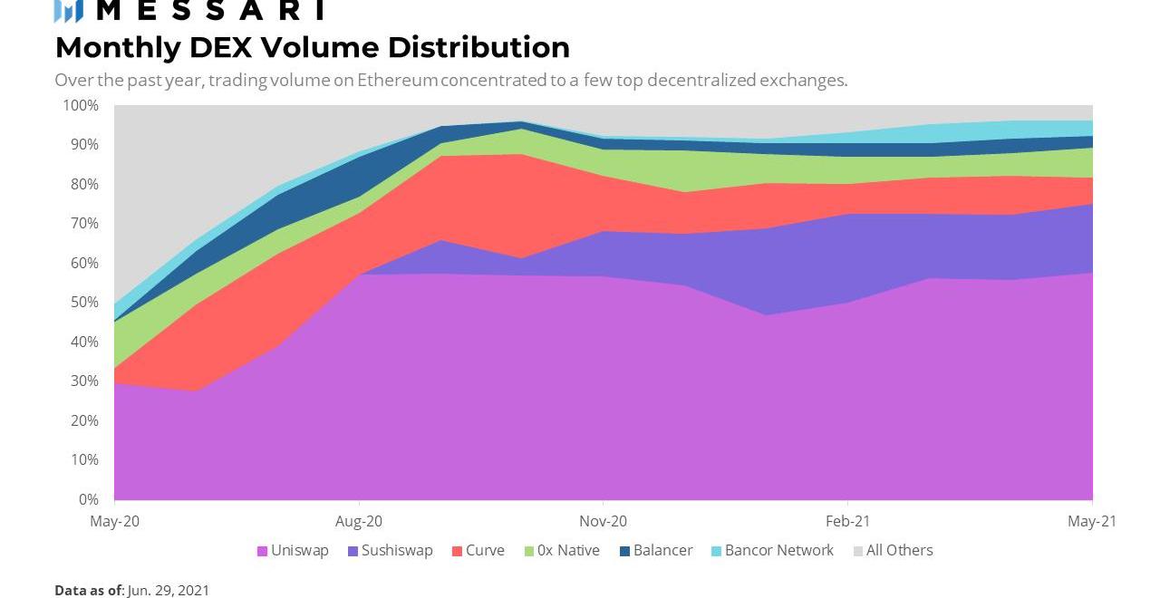 Uniswap和Sushiswap在過去一年中以被動流動性主導了DEX市場。這些和其他頂級DEX匯集了來自尋求存款收入的代幣持有者的資產供應。自動化銷售機制使DEX能夠無縫滿足大多數市場需求,然而,0x的市場份額顯示,近7%的DEX交易需要活躍的流動性。