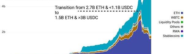 DeFi的寵兒DAI,MakerDAO的穩定幣歷來由各種資產支持,主要是ETH。隨著時間的推移,它已經增加了對美元的風險,使用USDC和其他集中式穩定幣作為在經濟低迷時期保持匯率的主要手段。請注意,進入5月份之后,MakerDAO在其資產負債表中增加了大量USDC。
