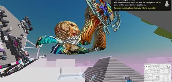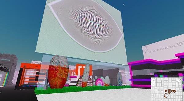 我第一視角墜入一個平臺的二層,伴隨著古早紅白機的8-bit游戲配樂。周圍的一切都像游戲《我的世界》一樣由像素格子堆成,不同的是像素格子大小不一,創作者可以在格子的表面添加非像素貼圖。