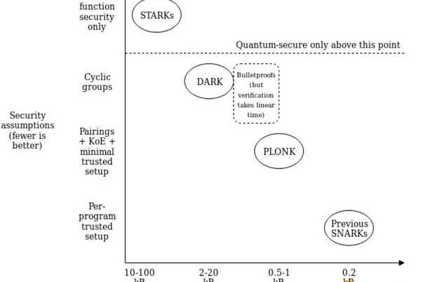 其中,安全性最高的是STARKs算法,其不依賴數學難題假設,具有抗量子性,并實現了透明通用字符串;Proofsize最小的snarks協議是groth16算法;Plonk是SNARK協議中的一個算法,Proofsize和安全性處于適中狀態。