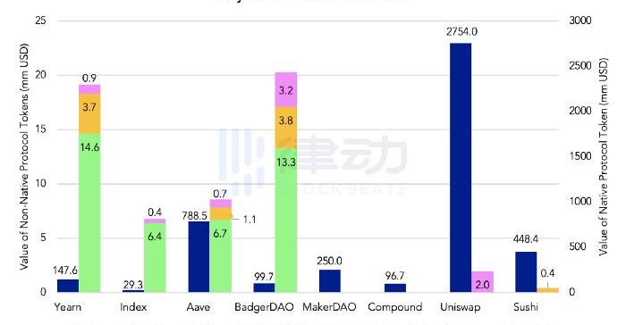 盡管許多DeFi項目現在明白將價值累積作為代幣經濟中一部分的重要性,但并非所有DAO都會將協議產生的費用/收入進行留存。例如Aave、Yearn、BadgerDAO和IndexCoop都會將協議收入保留在其DAO的金庫中,但Sushi、Compound、Uniswap和Maker目前就不會這樣做。與任何高增長公司類似,當投資于核心業務的投資回報率高于資本成本時,向股東支付「股息」是不合理的。此外,DAO還應該仔細考慮他們收入的組成結構:Aave和Yearn的大部分收入來自于生息穩定幣,而IndexCoop的收入大部分來自于他們的高風險產品。因此,DAO至少應該保留協議收入的一部分,并仔細考慮這部分收入的組成結構。
