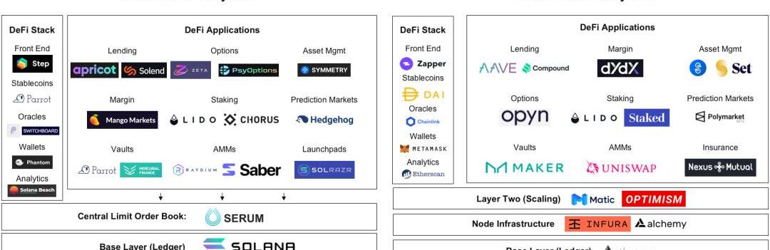 我之所以選擇這兩個生態系統來關注,是為了顯示在兩個不同的底層協議上構建的DeFi應用程序的廣度。我也相信Solana是最有趣的新Layer1協議,因為它的高交易吞吐量,亞秒級的延遲和交易確認時間,以及在Solana協議之上構建DeFi應用程序的快速增長的開發者生態系統。