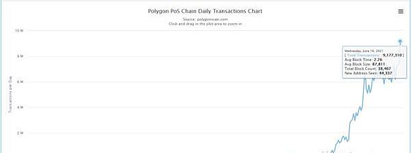 Polygon日交易數整體趨勢攀升,6月16日高達9,177,310筆交易。?