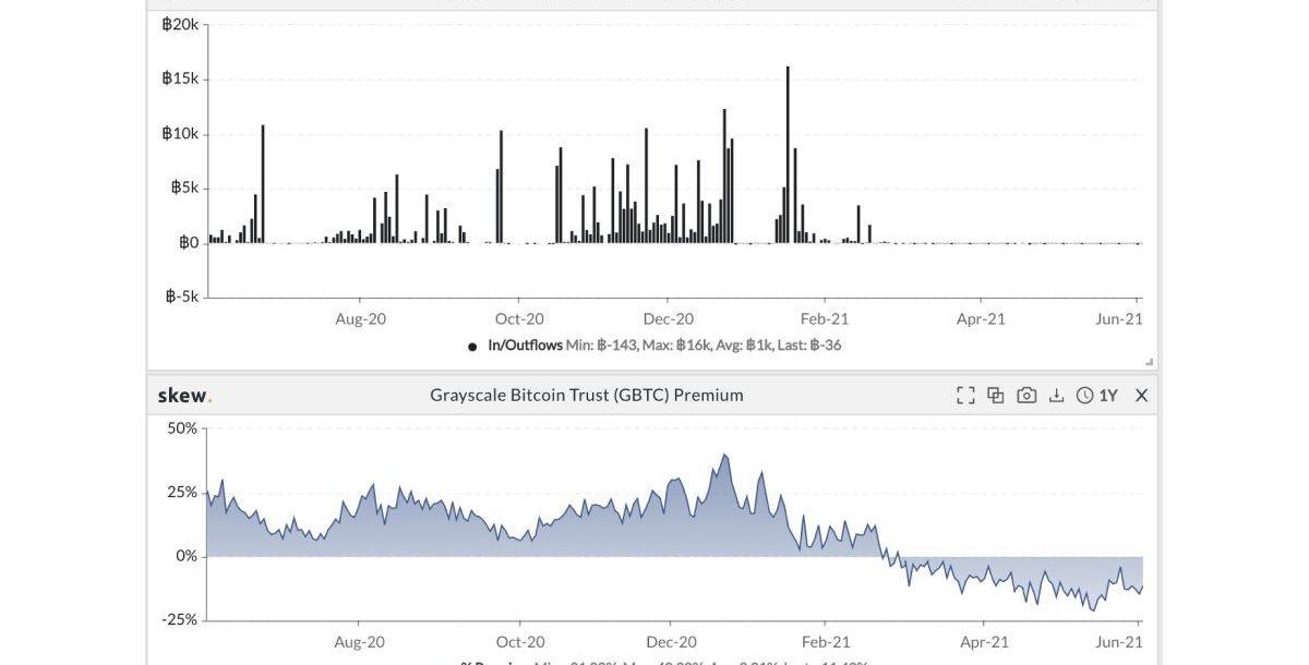 但在比特幣2月至4月價格上漲期間,GBTC的溢價仍為負值。當比特幣由于獲利回吐、中國的加密貨幣禁令和特斯拉的比特幣拋售謠言而開始下跌時,GBTC溢價跌至-40.20%的歷史新低。