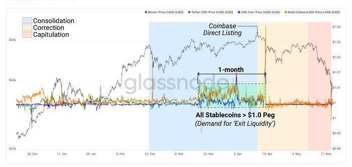 3、Coinbase上市之后,我們從穩定幣價格變化可以看出市場分銷正在進行中,在市場大量拋售之前,早期投資者持有的比特幣正在被拋售。