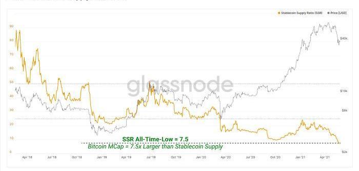 如果SSR值較低,則意味著相對于比特幣市值,穩定幣供應量較大;