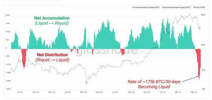 根據非流動性供應變化指標,我們可以看到過去30天里比特幣從流動狀態轉變為非流動狀態的比率——近兩年的積累幅度可想而知,但5月份的拋壓規模也可圈可點。毫無疑問,在最近的市場拋售中,投資者顯然受到了驚嚇。?
