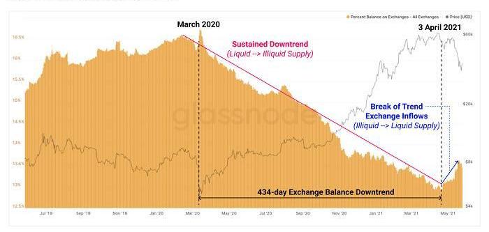 2、2021年4月下旬至5月中旬,這段時間,人們發現一些早期投資者開始拋售自己的比特幣,這可能有兩個原因,一個可能是資本輪換,另一個可能是為了應對疲軟的市場結構而選擇“割肉”。?