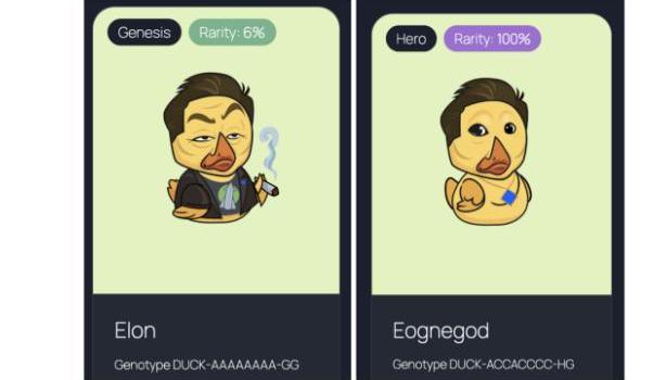 這不像DeFi世界里的純粹Farming,這需要玩家真實參與,就是說錢沒那么好賺,如果運氣不太好,最好玩家是個資深的QQ空間玩家。那么來看看官方認為稀有的鴨子長什么樣吧,不好形容,左邊這只有綠色標簽的已經算稀有了,右邊這只紫色標簽可以說非常稀有。