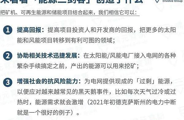 另一方面,比特幣是能源再生和儲能外一個理想的補充技術。把發電、儲能和礦機三者結合起來,比單純的發電+儲能成本更低、效率更高。因為比特幣礦機帶來的收益能夠平攤電池擴容的成本,同時能在電力需求不足的時候吸收過剩的閑置太陽能,更大的電池能在電力需求激增的時候給電網供電。