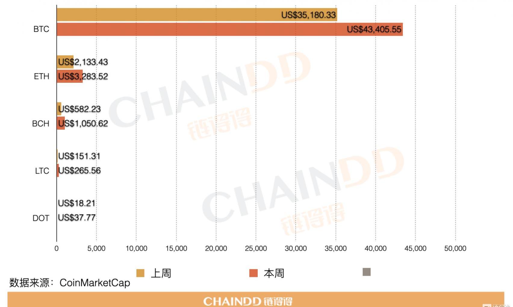 據得得智庫數據統計,截止2021年5月24日12:30,上周主流數字貨幣市場大幅下跌。