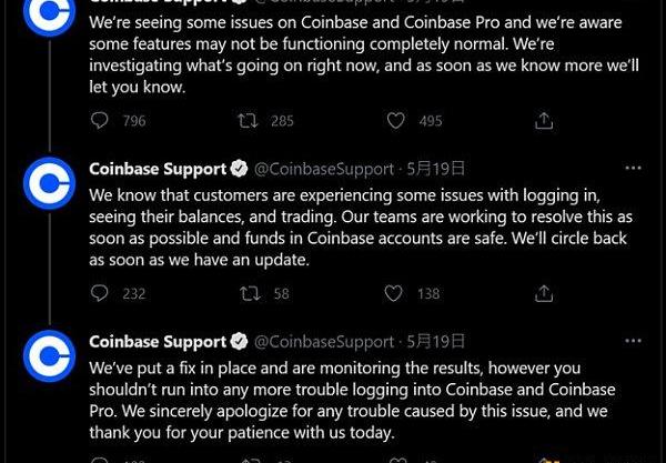 Coinbase則是在推特公告,已知用戶在登錄、查看資產余額及交易上無法正常操作,正努力解決相關問題。