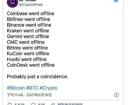 在推特超過18萬人追蹤的Mr.Whale整理了一份當機名單,包括Coinbase、Bitfinex、幣安、Kraken都榜上有名。