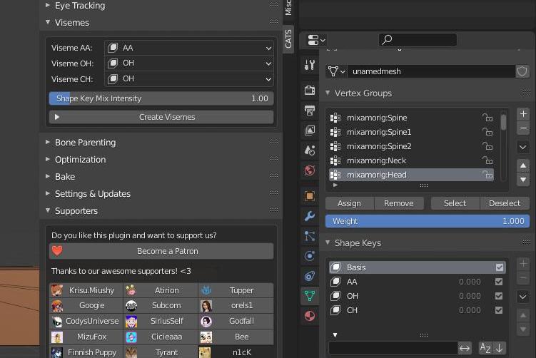 進入CATSBlender插件并打開“Visemes”選項卡。使此菜單變寬,更改3個默認Visemes以匹配剛設置的ShapeKey的名稱。