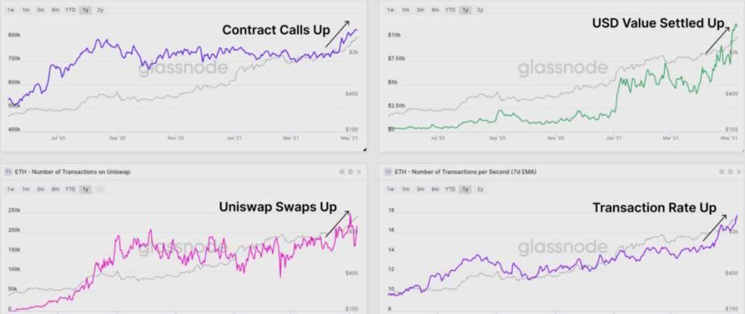 在過去的幾周中,以太坊鏈上的活動顯著增加,這表明鏈上的經濟流量支持了價格上漲。鏈上的許多指標都有強勁增長,包括總交易匯率和以ETH轉移結算的美元,僅舉幾例。