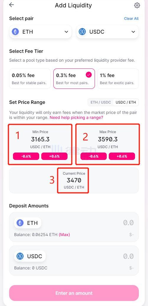但是這里用戶不需要擔心,我們只要在其中輸入自己想要的價格,系統就會自動幫你將你輸入的價格調整為最近的一個可選價格點。如果認為不滿意,只需要點按下方的粉色按鈕進行微調即可。我們在這里選擇輸入3165.3USDC與3590.3USDC,作為我們的做市范圍。