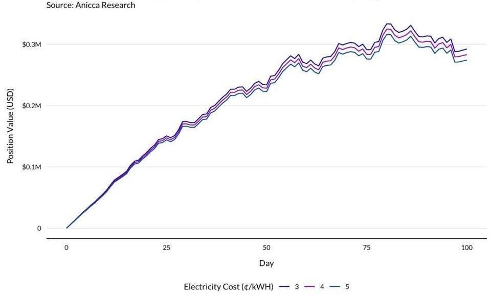 在這種情況下,相比每天賣出比特幣,保留比特幣倉位的利潤要高得多即使電價很高也是如此。考慮到比特幣價格的快速升值,這是有道理的。