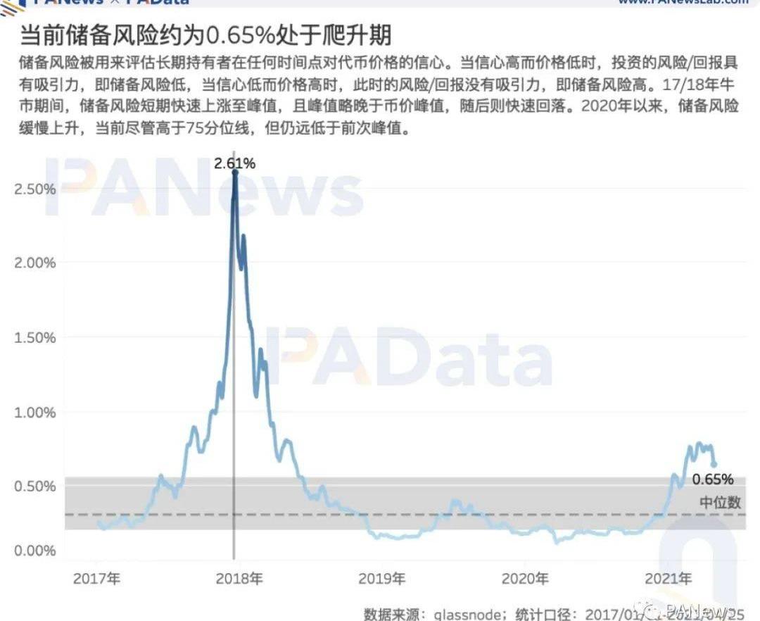 17/18年牛市期間,儲備風險的峰值約為2.61%,指標峰值出現的時間略晚于幣價峰值出現的時間,且指標峰值前后的半年時間內,指標先表現為短期快速上升,后表現為短期快速回落,并且始終高于75分位線。
