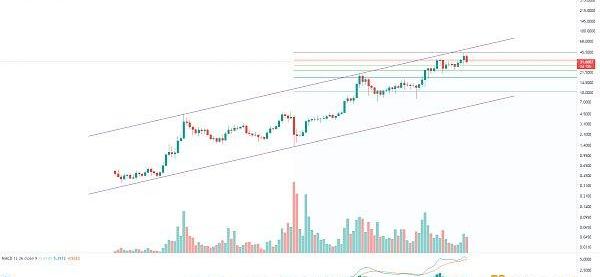 仍是震蕩向上的走勢,回調也未破關鍵支撐,目前沒有出現見頂跡象,有耐心的可以持幣,周線支撐27.5美金。