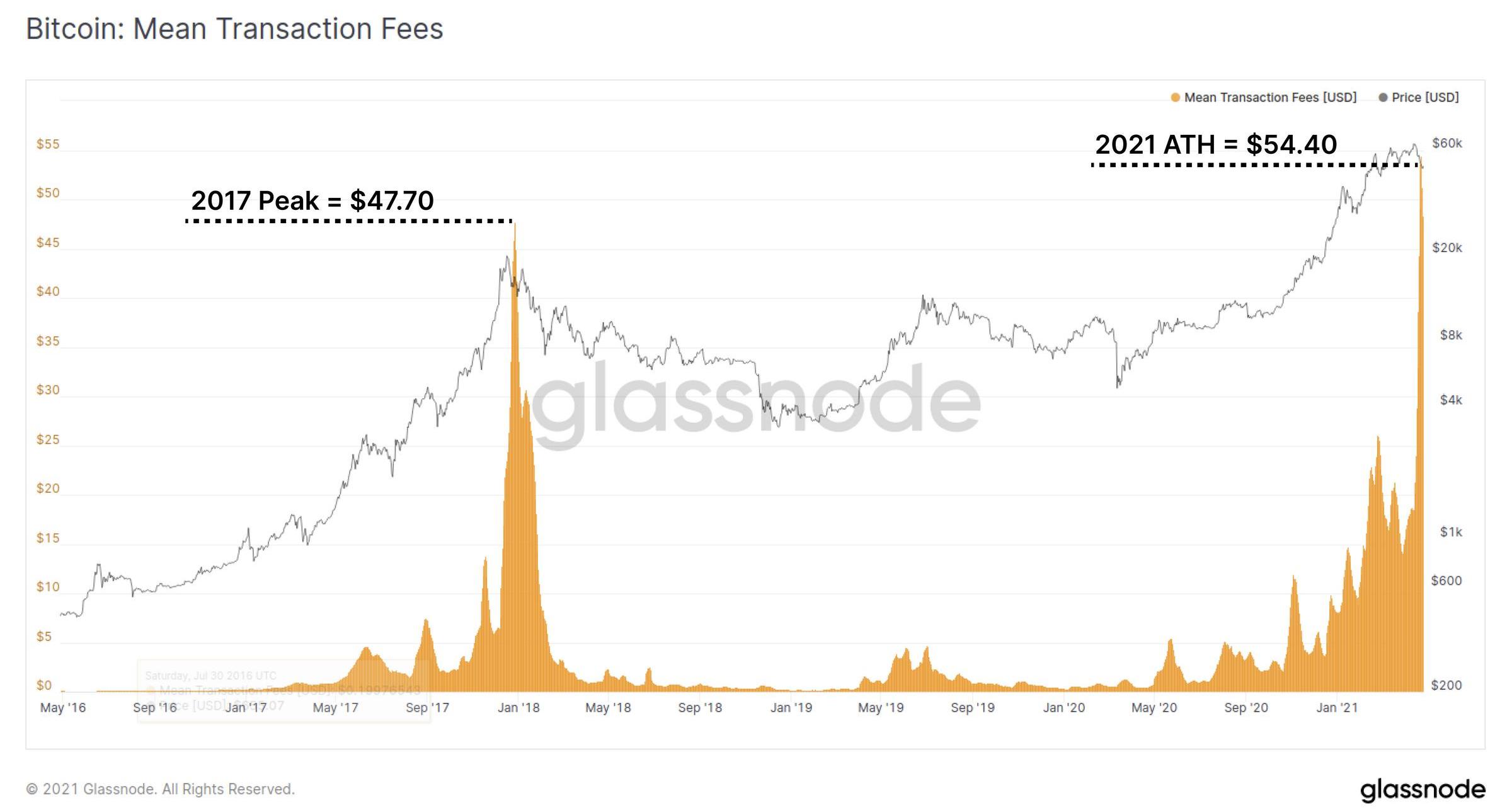 而對于用戶來說,最直觀的影響就是比特幣平均交易手續費攀升至54.4美元的新高值。