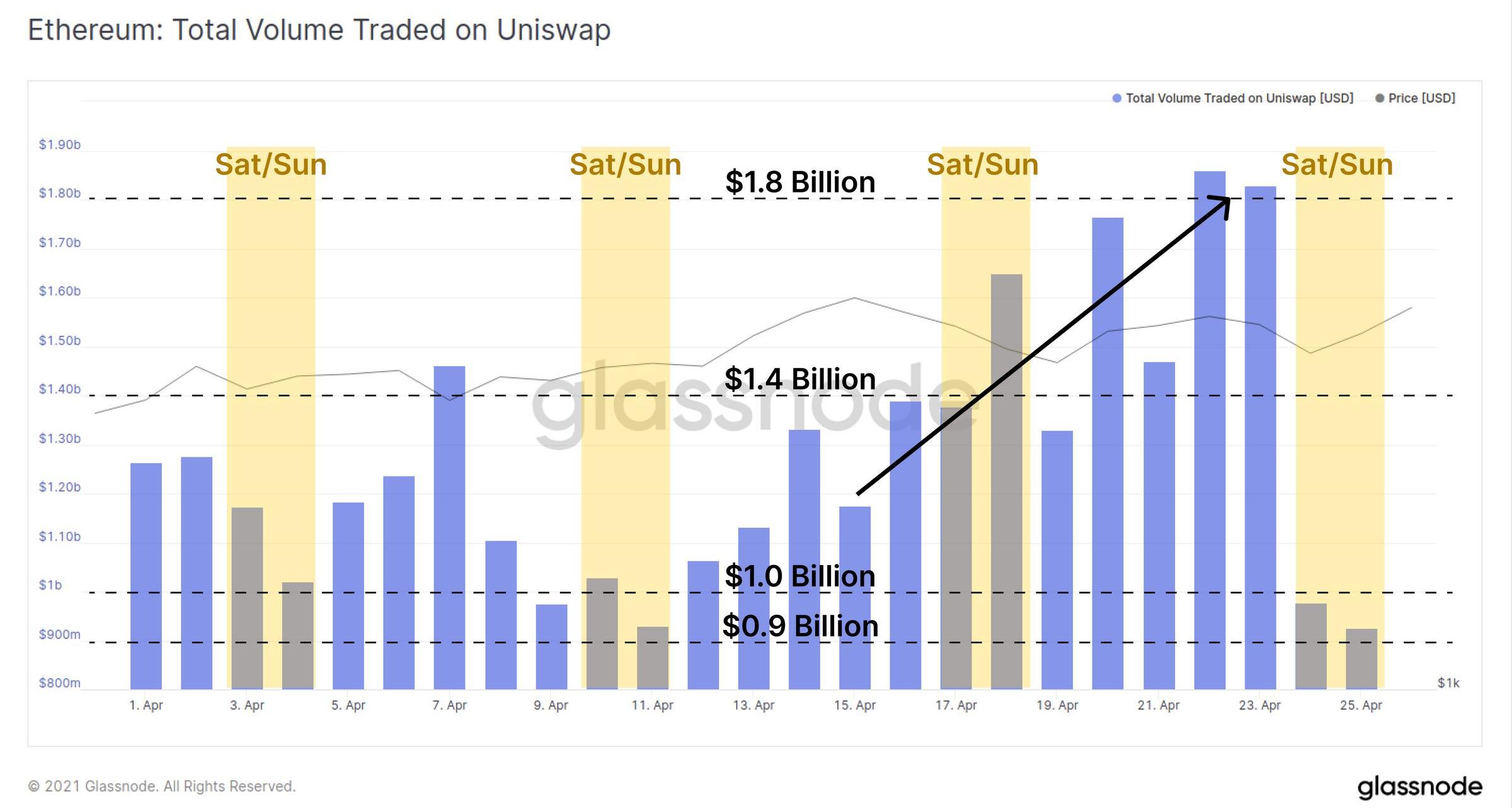 Uniswap的交易量在上周也繼續走高,峰值日交易量達到了18億美元。降低的gas費用以及價格調整顯然為Uniswap交易者提供了新的機會。