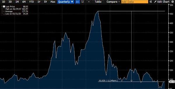 這是代表歐洲主要銀行的EuroStoxx銀行指數的生平圖。目前仍然比高點跌了百分之八十。