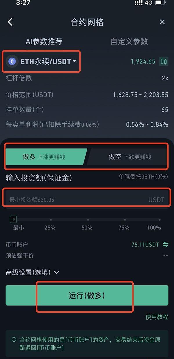 2.輸入投資額,網格合約使用的是幣幣賬戶中的資產,請確保幣幣賬戶中有足額資金。