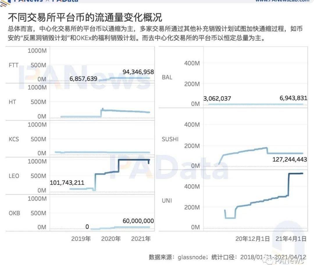 今年,11種平臺幣的平均市值漲幅高于平均幣價漲幅,這在很大程度上受到DEX持續分發激勵,即增加供應量有關。實際上,CEX和DEX的平臺幣有著完全不同的通證模型的設計邏輯。從glassnode統計的部分平臺幣的流通量變化情況來看,CEX的平臺幣主要以通縮為主,而DEX的治理代幣以恒定總量為主。