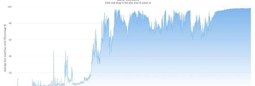 基于上述非常粗略的估算和推導,我們可以大致估計k約等于1.8。而圖3所示的網絡使用率圖表顯示從2020年5月初開始,以太坊區塊鏈就進入長達10個多月的滿負荷運行狀態,正好印證了前述推導中關于第四個階段網絡規模已超過網絡承載能力的假設。
