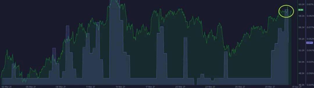 例如,以比特幣的融資率為例。幾天前的記錄為+0.10%,非常接近幾周前的0.12%的水平。后者在3月份的歷史最高價時出現,隨后價格大幅下跌。