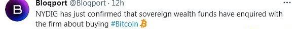 加密分析機構Bloqport今日發推表示,紐約數字投資集團證實,已經有主權財富基金已向該公司詢問購買比特幣的事宜。
