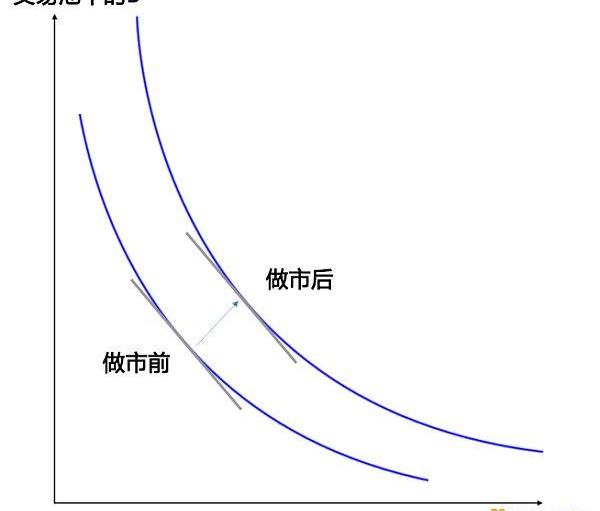 當用戶參與做市時。池子中的A和B都在增加,所以點是向右上方移動的。而且,做市是不能改變A和B的比例的。