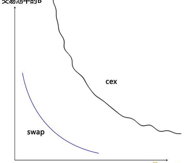 我們知道事實上兩種幣的交易應該是符合需求曲線的。但是在CEX,也就是傳統交易所中,會有價格的波動。所以它的曲線是有波浪的。