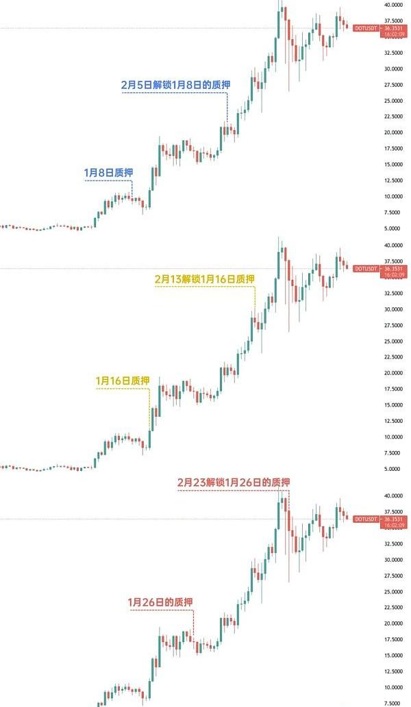 DOT最近三次大規模解鎖分別為2021年2月5日、2021年2月13日、2021年2月23日,以史為鏡,我們分別看一下這三次解鎖對價格造成的影響。