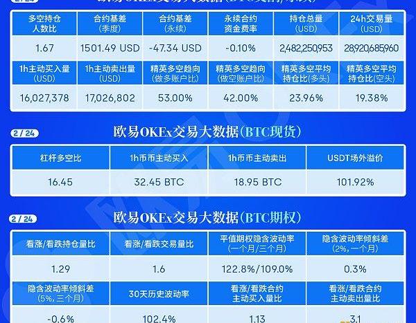 歐易OKEx交易大數據:BTC合約多空持倉人數比1.67,合約持倉總量為24.8億美元