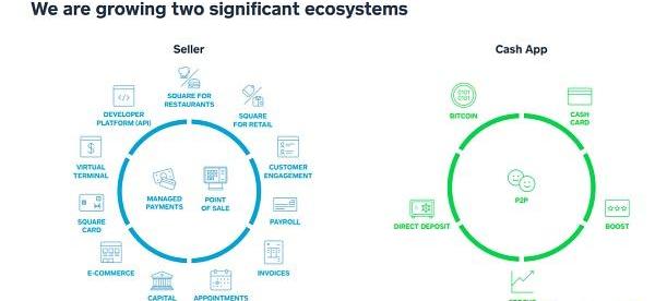 Square提供了兩套完整的產品生態,一套是他們的SellerEcosysterm,面向中小零售商提供支付服務,一套是CashApp生態,以P2P支付為核心,提供了包括比特幣在內的多種服務。