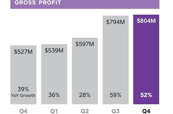 根據20年第四季度財報,Square在第四季度毛利潤達到了8.04億美金,同比上漲52%。其中,SellerEcosysterm帶來了4.27億美金的毛利潤,同比上漲13%;CashApp毛利潤3.77億美金,同比上漲162%。