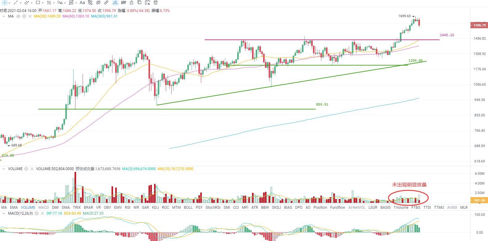 ETH稍早前最高一度攀升至1700美元,隨后滯漲回落,截止發稿前最低回落至1573一線,振幅達到7%,說明在當前價位區間市場分歧明顯增大。不過從走勢結構看,低點逐步抬高的特征并沒有發生變化,說明上升趨勢沒有被破壞。