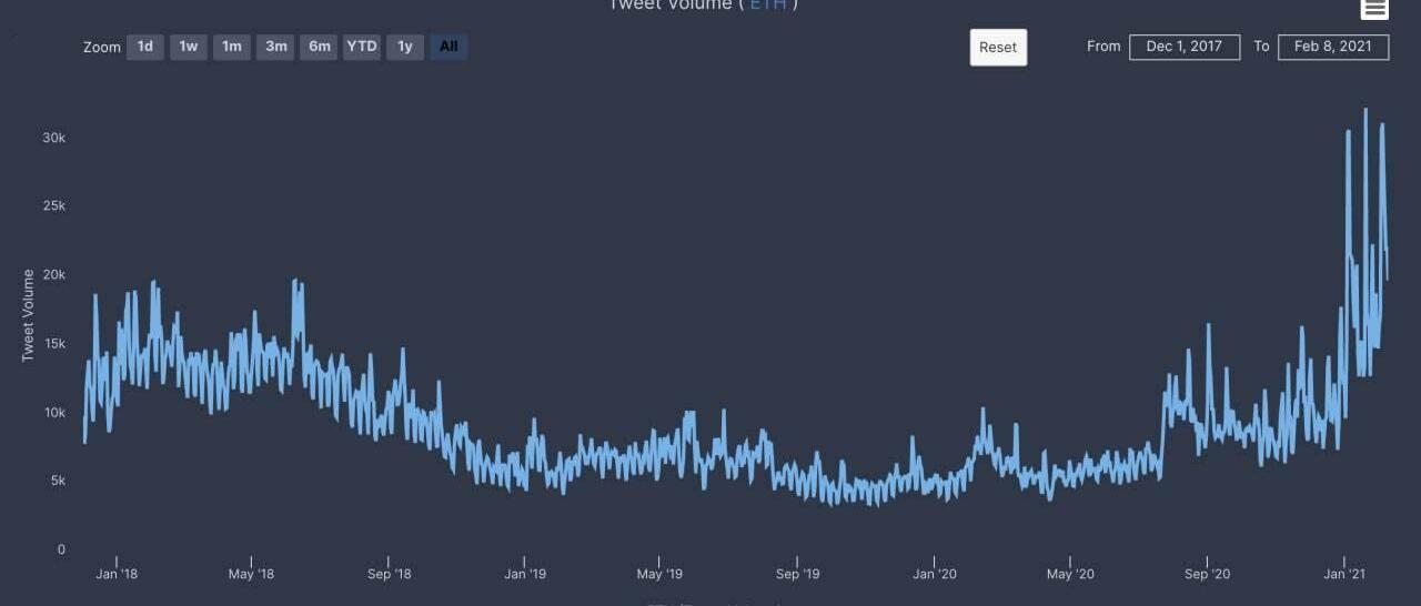 馬斯克的推文似乎將加密貨幣推特的注意力從芝加哥商品交易所(CME)2月8日備受期待的以太期貨合約的推出上轉移開了。Frank指出,以太坊的推文量在最近創下新高后下跌了一半: