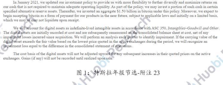 具體來看,減值測試將按季度進行,并最終體現在年報中。而公允價值則參考當期活躍交易所的最低交易報價確定,若低于該報價將計入減值損失,體現在資產負債表中。數字資產作為無形資產計入財報的上限將始終是其成本,不會隨著市場報價上漲而上調,收益在公司出售BTC前也不會被體現在財報中。另,根據美國GAAP會計體系,無形資產的減值損失不可回調,即若特斯拉的15億美元投入隨著BTC價格下跌出現虧損,如在第一年下降至10億美元,公司將下調資產至10億美元;此后若第二年漲回15億美元甚至更高,財報中該項資產將始終體現其10億美元的價值。此外,將加密資產歸入無形資產下或可幫助特斯拉應對未來或將產生的稅收。美國國稅局此前指南下,購買、持有等目前屬于非稅事項,僅就產生資本利得即包括法幣出金、幣幣交易、支付商品或服務、或通過空投挖礦分叉等形式賺幣的形式計稅。盡管如此,由于細則遲遲不落地,持幣未出售的浮盈未來或有繳稅風險;而無形資產不計入收益的形式可在規則變化下避稅。